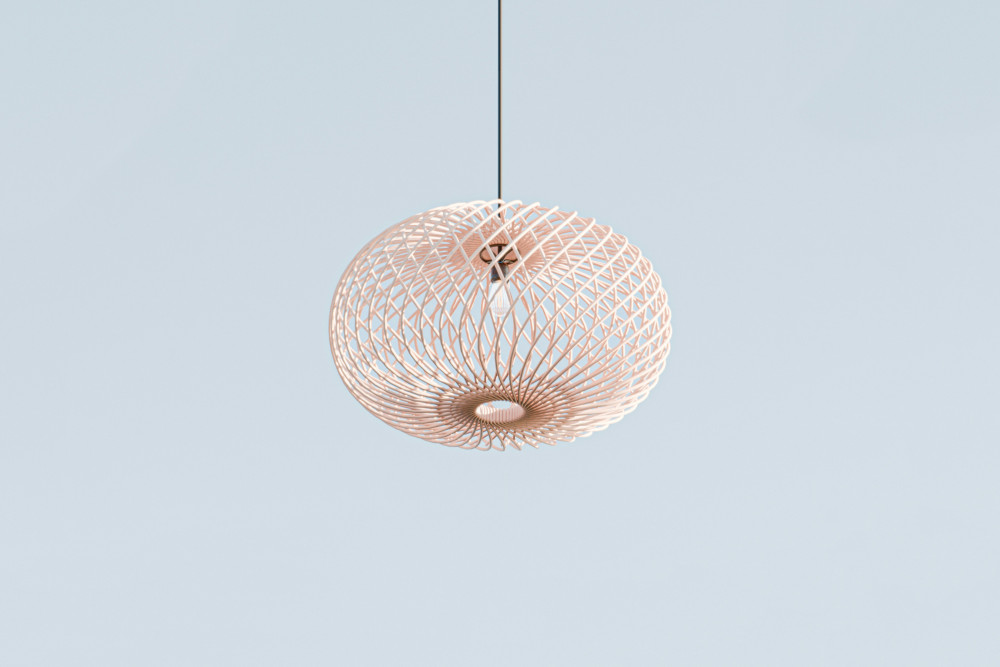 - Oval skjerm i hvitt garn: Skaper et luftig uttrykk og et mykt lys.