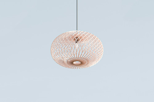 Den ovale lampeskjermen er laget av tekstil som filtrerer lyset og skaper en myk, 360 graders belysning. Det strikkede mønsteret gjør hver lampe unik og tilfører rommet en varm og behagelig atmosfære.
